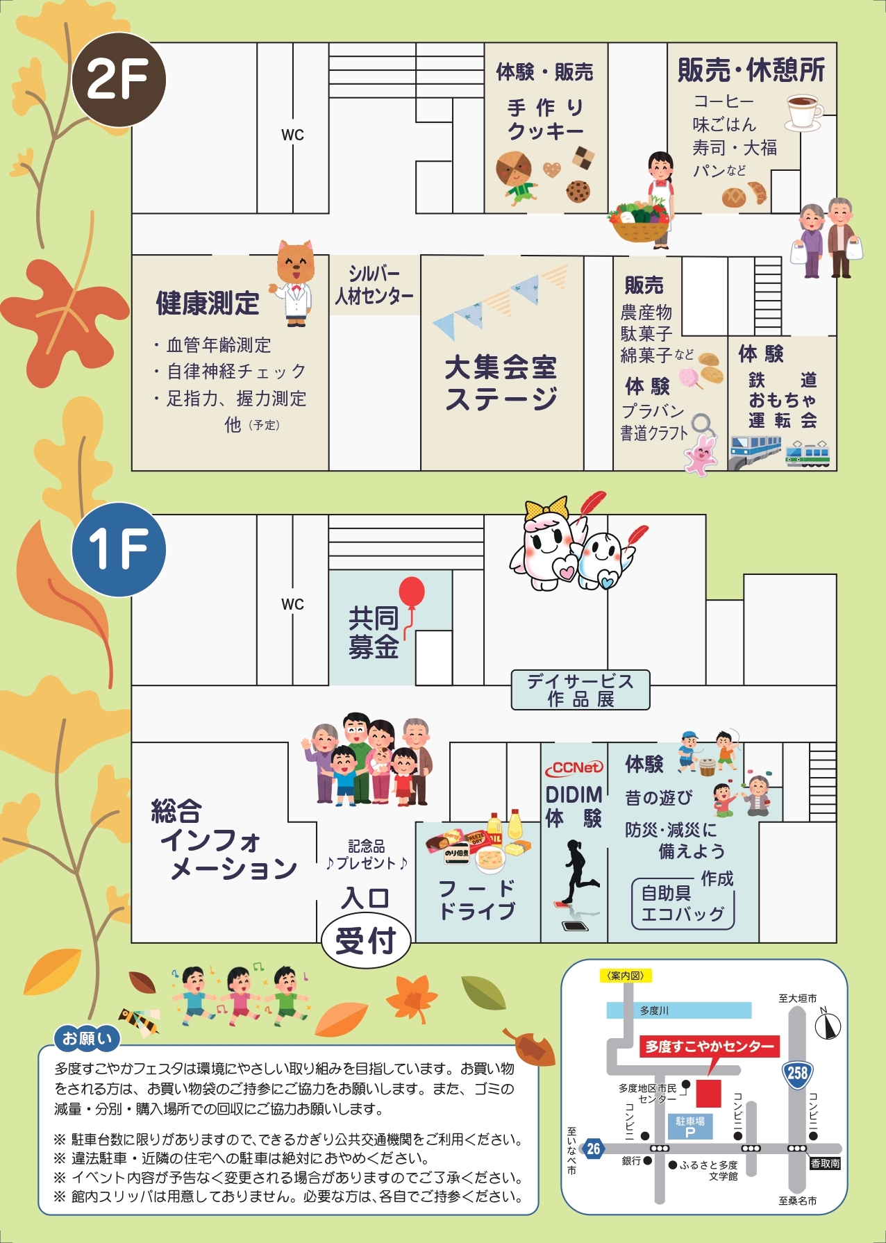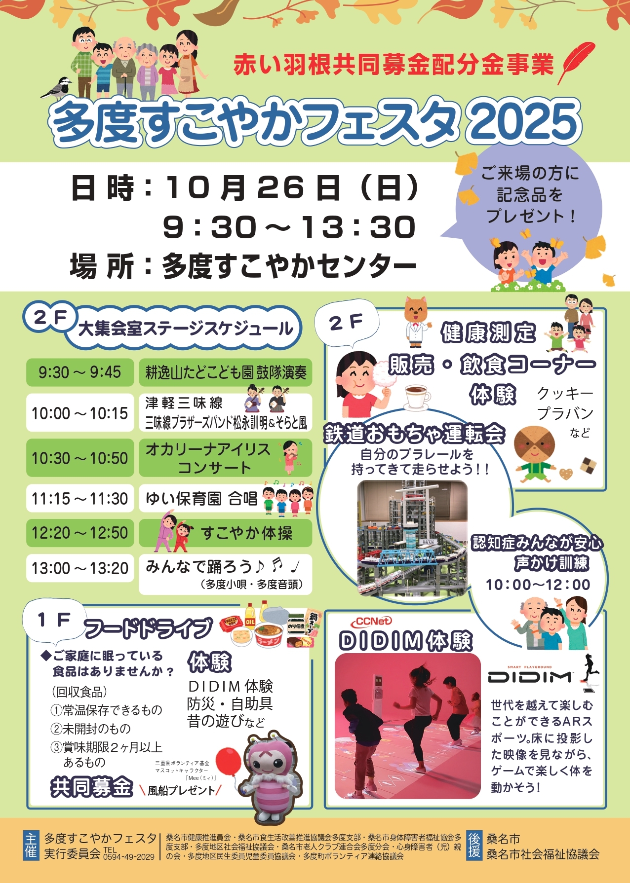 多度小唄を踊ろう、健康測定、防災コーナー、昔の遊び体験、など、今年も楽しいイベントを準備して、みなさまのご来場をお待ちしています。