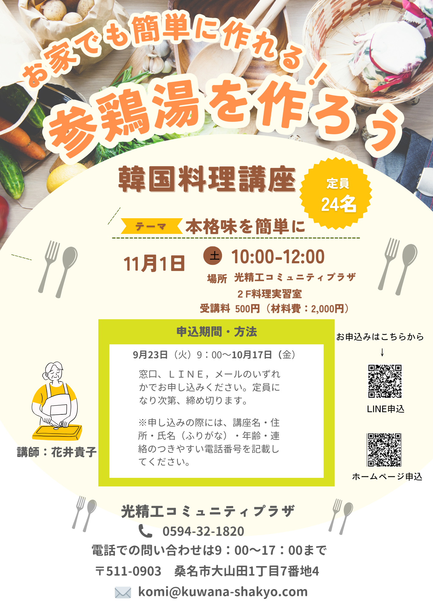 講師アレンジレシピでいつでもご家庭でできるオリジナル参鶏湯(サムゲタン)を作ります。