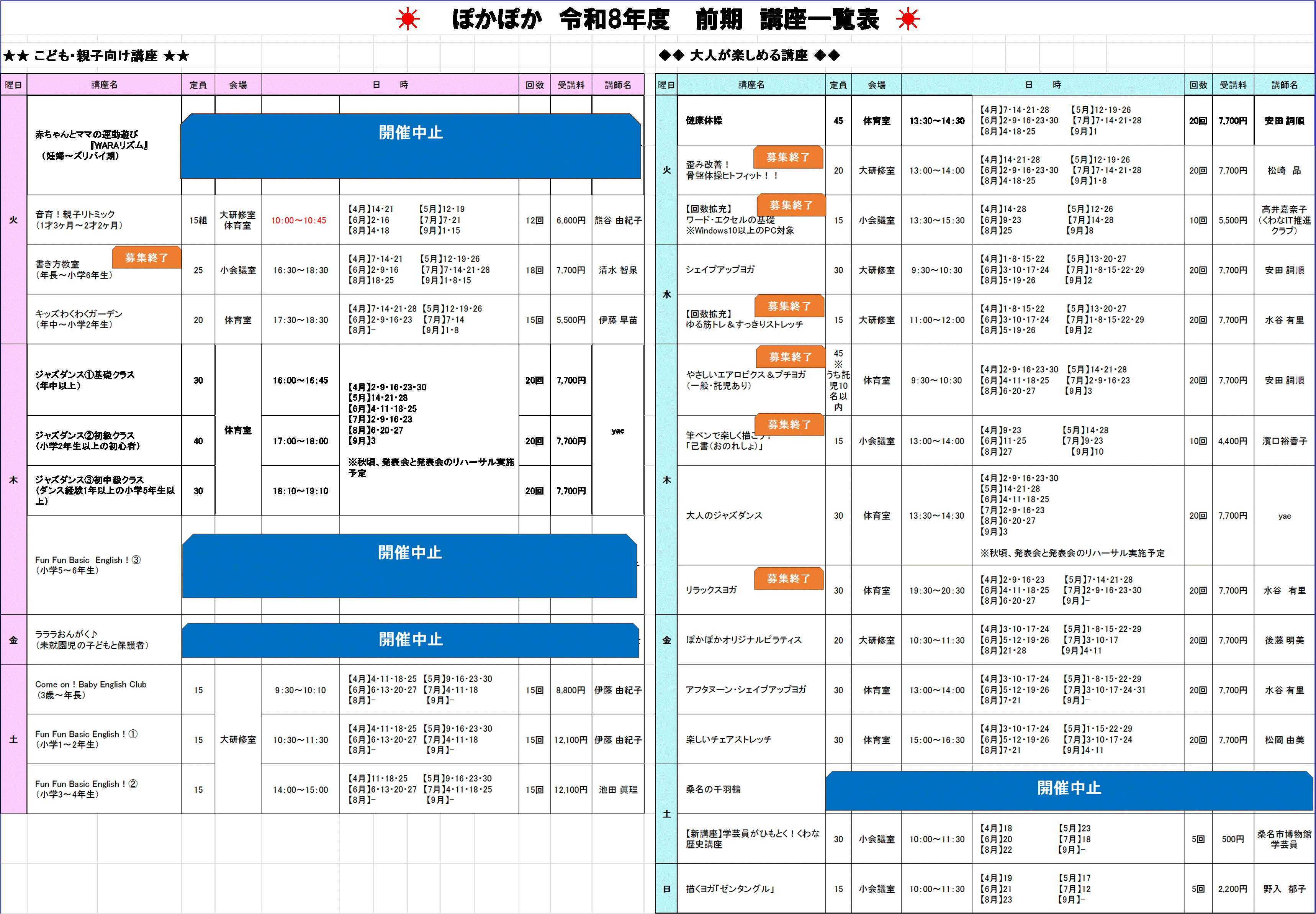 ・追加募集ですので、定員に達している講座は申し込みできません。