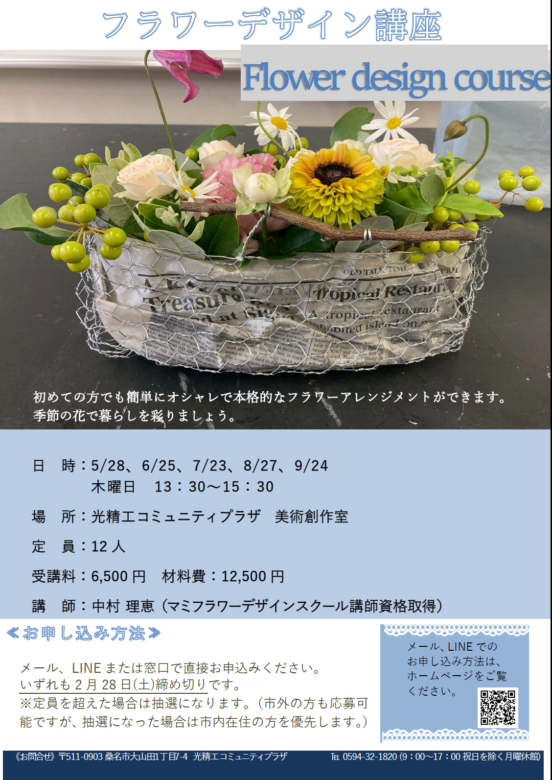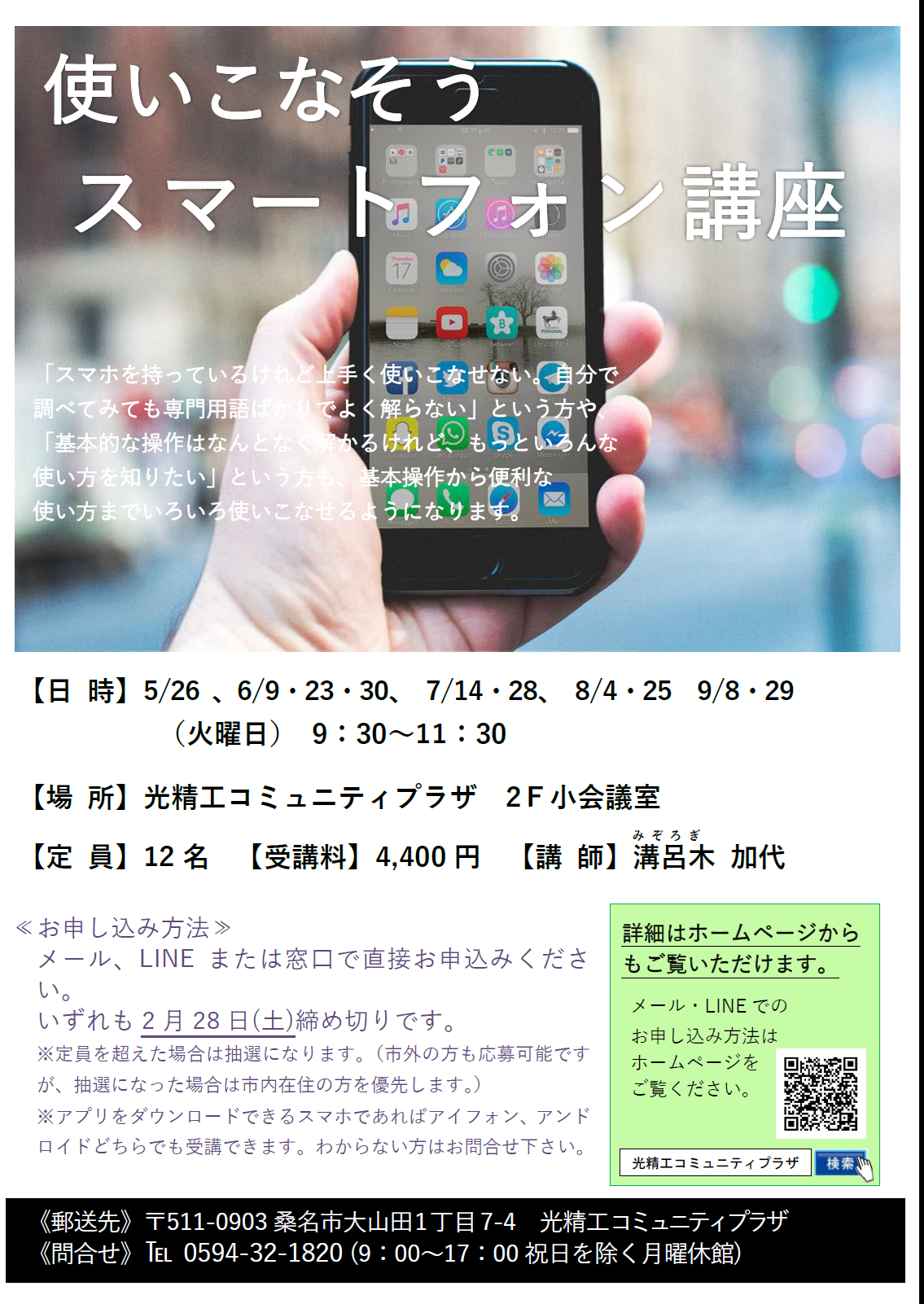 ★3月7日(土)午前9時に光精工コミュニティプラザにて先着順に申込受付いたしますので、受講料をご持参の上当館へご来館ください。定員になり次第、受付を終了いたします。