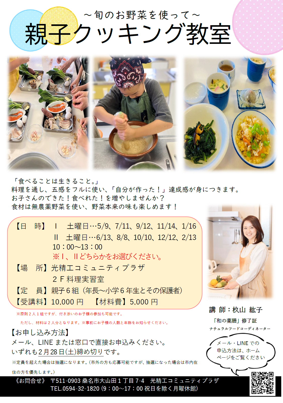生きていく上で必要な「食」。お料理を通し、食材への興味、食べれた!を増やしませんか?季節の食材を知りながら、家庭でも作れる簡単クッキング。 親子で楽しく料理をしながら食育しましょう!